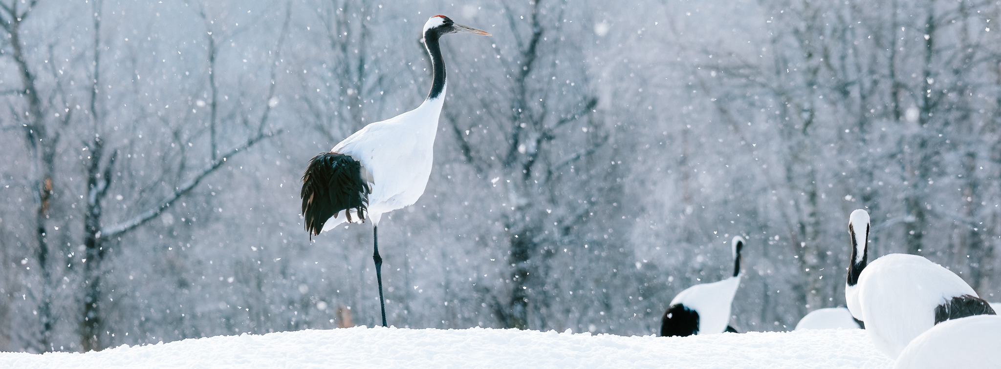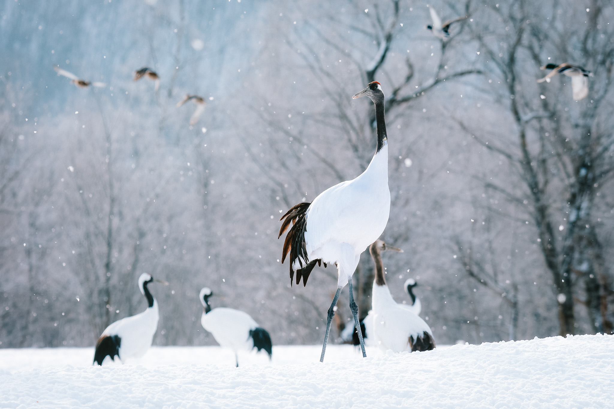 As soon as I arrived, the scene was alive with movement—cranes were flying in, jumping, and competing for food. The light was perfect—the sun had broken through, yet it was still lightly snowing, with a thin layer of fresh snow covering the trees in the background. The entire landscape was sparkling, creating an almost ethereal, dreamlike atmosphere.