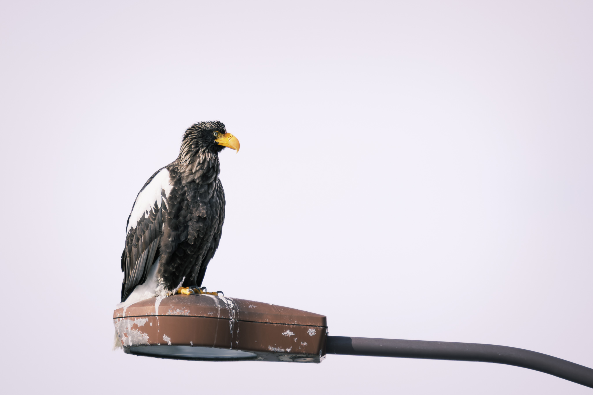 Before I even made it into the back roads, I had a lucky sighting—a Steller’s sea eagle perched high on a lamppost. This was my first chance on the trip to photograph one up close. With their massive size, bold black-and-white plumage, and bright yellow beak, these eagles have a commanding presence. I stopped the car and watched for a while, hoping to capture the moment when it would take off. After waiting patiently for ages, I mistimed its flight and missed the shot of it launching into the sky—a frustrating but common experience in wildlife photography! Still, I was happy to have captured some solid portraits of this majestic bird.