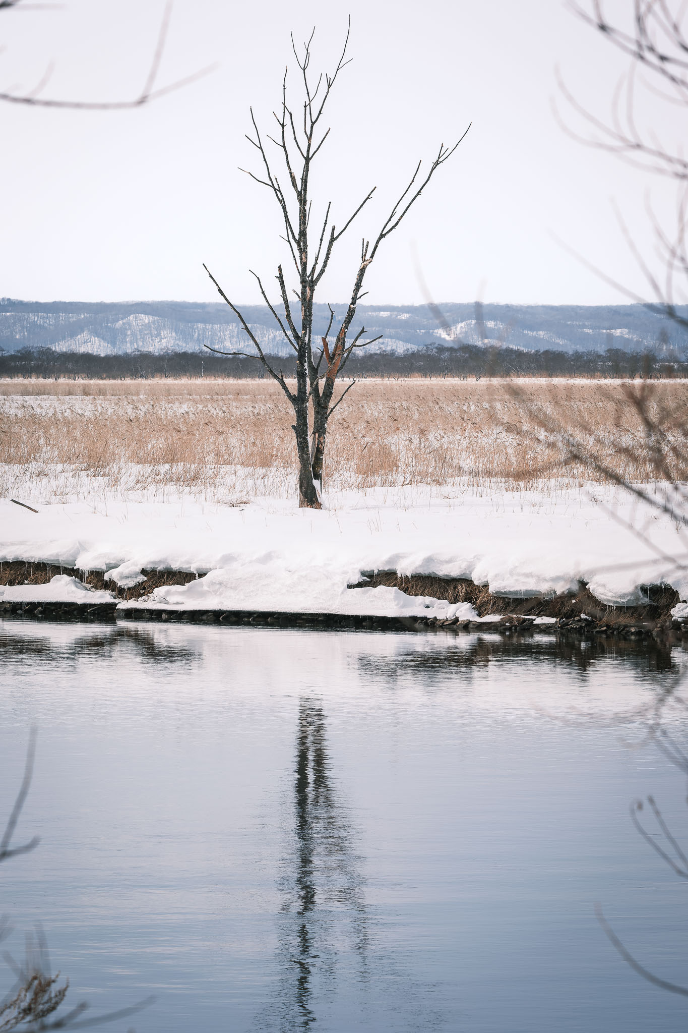 As I drove deeper into the wetlands, I came across a cluster of old trees standing beside a slow-moving river. The contrast between the leafless, skeletal branches and the still, reflective water made for a striking composition, so I stopped to take a few landscape shots. The scene felt completely tranquil and untouched, with no other people around—just the soft sound of the wind moving through the reeds.